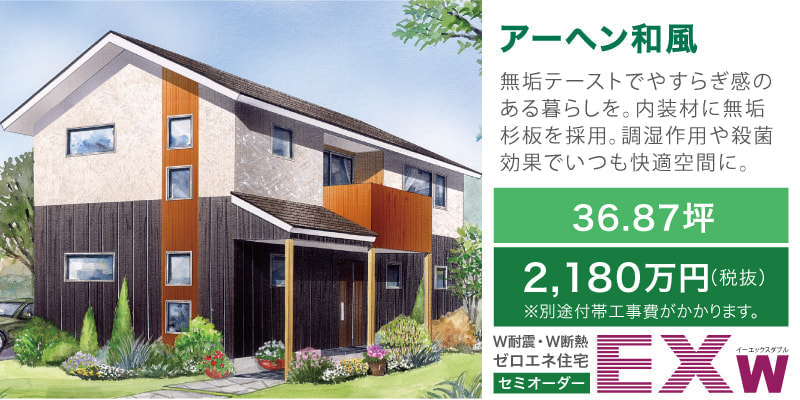 HOME | 住まい等の新築 | セミオーダー住宅 | アーヘン和風 | セミオーダー住宅 EXwの特性 | シンプルナチュラル|ストリーム|エクスナレッジ|アーヘン和風|アーヘンモダン| 耐震ゼロエネ長期優良対応セミオーダー住宅EXw アーヘン和風 「アーヘン和風」は内装材に無垢杉材を利用しています。やすらぎ感のある暮らしを望む方へ。 EXw イーエックスダブル(W耐震・W断熱・ゼロエネ、セミオーダー住宅)の5タイプのうちの1つ。考え抜かれた機能性を持つ長期優良対応住宅。35.87坪 2,180万円(税別・付帯工事費別) →EXw イーエックスダブル(W耐震・W断熱・ゼロエネ、セミオーダー住宅)の優れた機能性についてはこちら。 超低金利時代だから、[フラット35]などのローンを組んで家を建てるのが賢い家づくりの方法。 節税やすまい給付金制度、そして増税などを考えても、住宅取得は今がチャンスです! W耐震、W断熱・ゼロエネ住宅のバリエーションとしてスーパーエコイーエックスもございます。こちらも高機能でデザイン性、経済面で大変優れています。詳しくは お問合せください。 次の商品例へ 大喜建設の住宅・別荘新築例 お施主様インタビュー prev next